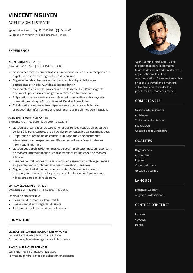 Un titre efficace doit clairement définir qui vous êtes et ce que vous recherchez. Il devrait mentionner votre profession, votre niveau d’expérience, votre secteur d’activité et, si possible, ce qui fait votre différence ou l’avantage que vous apportez. Exemples pertinents : « Agent administratif spécialisé en comptabilité avec expérience », « Assistant administratif junior dans le domaine de la santé », « Agent administratif bilingue (anglais-espagnol) », « Assistant de gestion polyvalent et méticuleux ».
